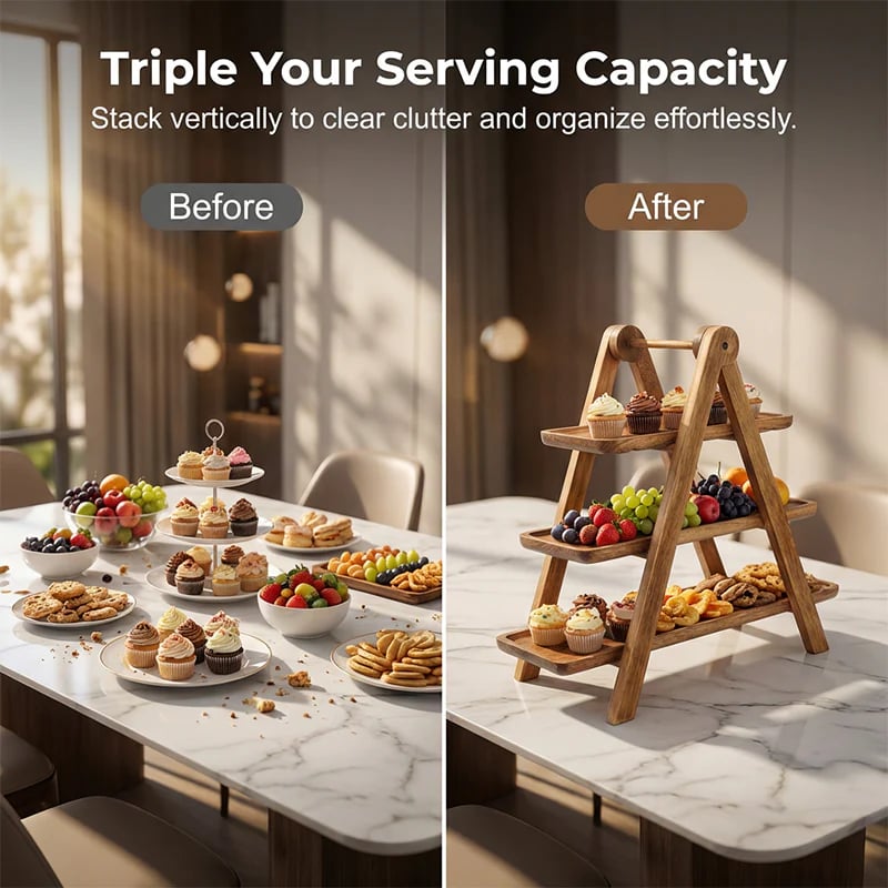 TRIPLE YOUR SERVING CAPACITY - Transform cluttered countertops into an organized display. This tiered wooden stand utilizes vertical space, allowing you to serve more dishes while keeping your dining table perfectly neat and spacious.