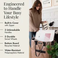 **Core Design:** Equipped with three shatter-resistant handles, five durable 360° steel swivel wheels, a stabilizing bottom support plate, and a zippered internal protective cover. It features a patented upright design: offering ample storage capacity when in use, yet folding completely flat when idle to save space—requiring no assembly and ensuring effortless usability.