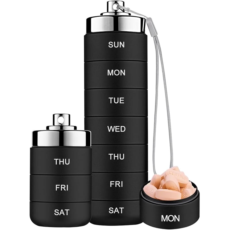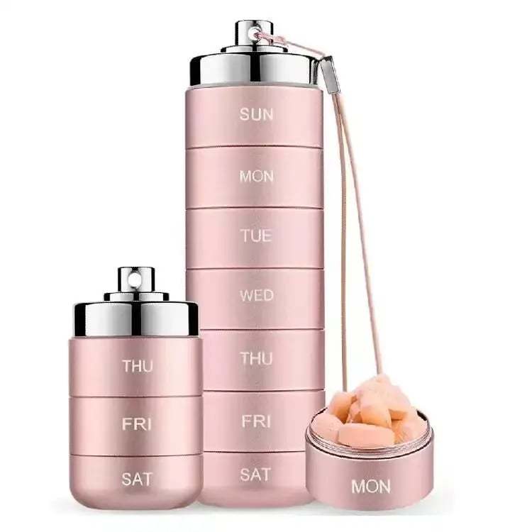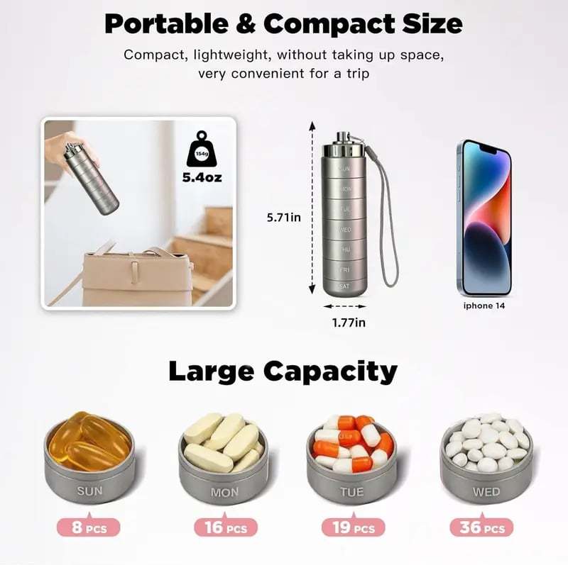 High-Quality Medical Metal Material : Instead of using cheap plastic, our metal pill case is made with BPA Free, reinforced shockproof durable Medical Aluminum Alloy, will not fall apart even a car roll over. Say goodbye to flimsy plastic weekly pill organizer , no more unexpected crashes, and choose a safe, strong medicine organizer for your pills.